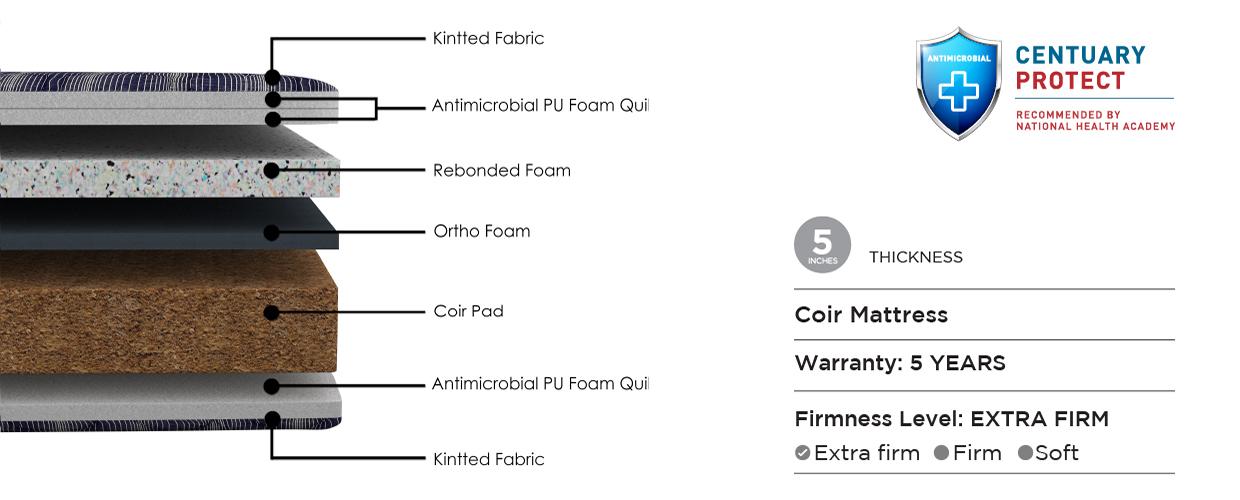 Centuary India incorporates cutting edge technology and high quality materials like rubberized coir, rebonded foam, and ortho foam to deliver a superior level of comfort and support.