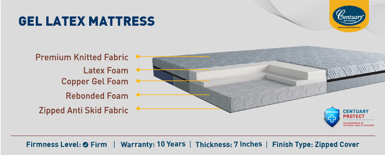 Crafted with stability, firmness, and durability, the Centuary gel latex bed mattress offers unparalleled support for a night of undisturbed rest. Wake up feeling refreshed, not because of a restful slumber, but because your mattress actively partners with your body throughout the night.