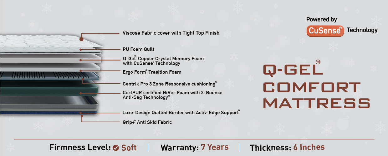 The Q-Gel Comfort mattress uses our proprietary CuSense technology to create a cooling sleep experience all night long. The memory foam layer of the mattress promotes spine alignment, and its Tight Top finish ensures that you enjoy a peaceful sleep through the night