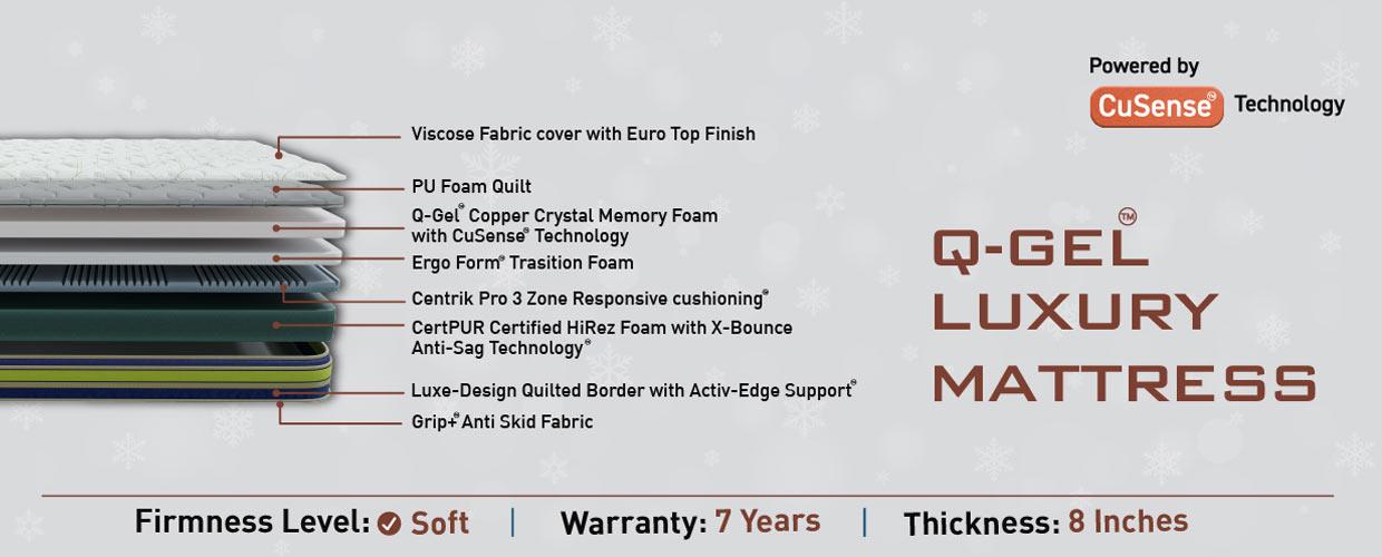 The Q-Gel Luxury mattress brings together the facets of a cooling sleep along with the cushiony comfort of a thick mattress to create a truly unique sleep experience. Its ability to contour to the body and relieve pain on the pressure points, along with the luxurious EuroTop finish, makes it the finest holistic mattress one can sleep on.