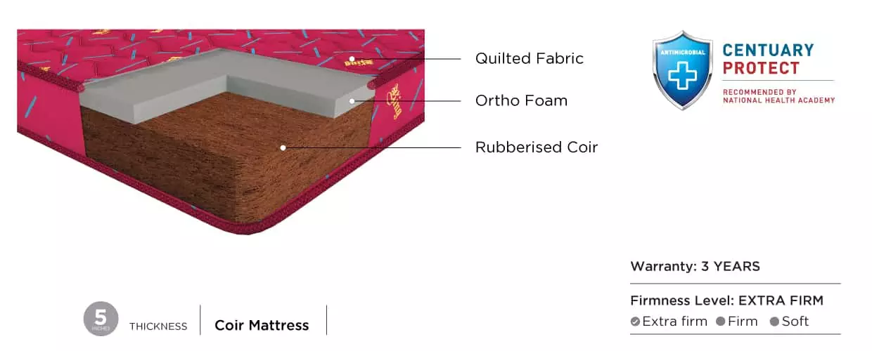As the name suggest King Coir is made of rubberized coir and supported by a layer of ortho foam. This mattress gives you firm and comfortable support through the night. The outer quilt is tough on bacteria, dust mites, and microbes thanks to Centuary Protect.