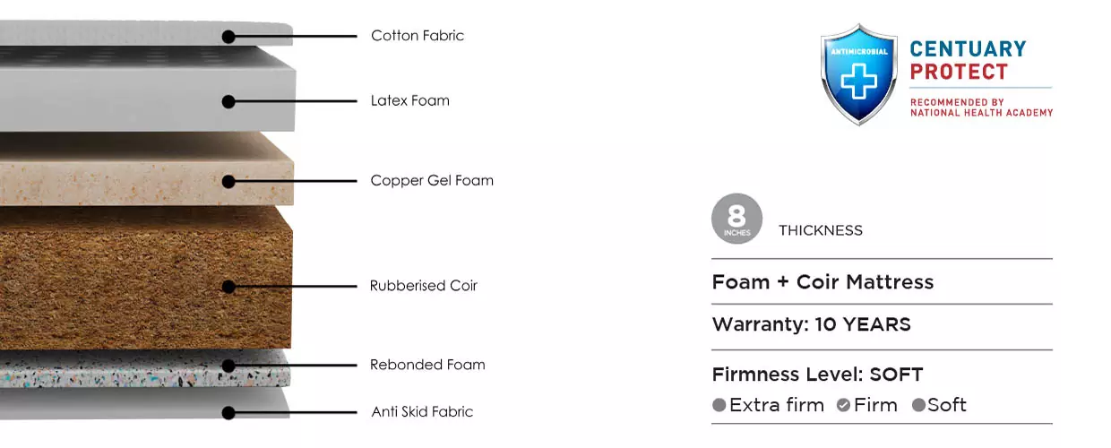 | Best Suited For | With its combination of latex foam for responsiveness, copper gel foam for cooling, and supportive materials like rubberized coir and rebonded foam, it caters to those who prioritise a cool, supportive, and comfortable sleeping experience. |