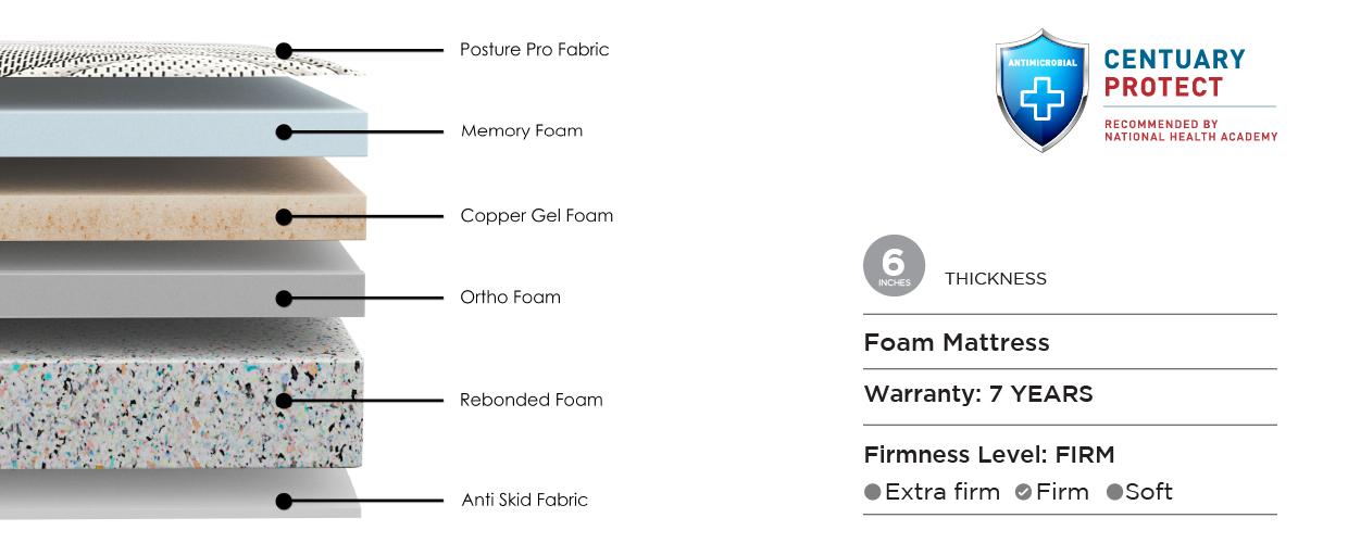 Your hunt for an orthopedic mattress with perfect spine support ends here. Posture pro provides the best back support, aligns your spine and body and ensures you a great sleep posture. It’s a right mix of rebonded foam, ortho foam and memory foam. The memory foam at the top conforms to your body shape, the ortho foam and rebonded foams ensure the firmness and support. The transition layer of the all new proprietary copper gel infused foam protects the mattress from over-heating and also from microbes.