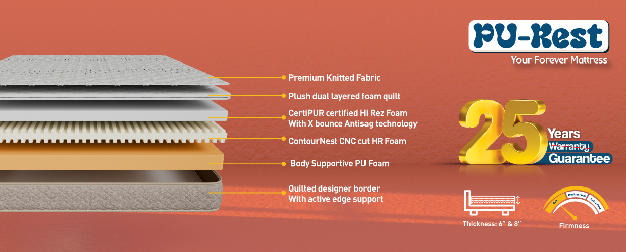 PU Rest is a CertiPUR certified reversible foam mattress at an affordable price point. As the name suggests, it is made using the ‘purest’ foams for enhanced comfort & durability, while finished with superior knitted fabric quilt. The proprietary ContourNest air flow layer ensures the mattress remains fresh over its extended life.