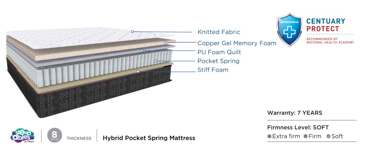 The Sleepables Hybrid Mattress combines the exceptional support of pocketed springs with the latest innovation in memory foam. The Copper Gel Memory Foam helps the mattress regulate the temperature and hygiene of the mattress surface. This mattress is an upgrade over your normal orthopedic support mattress with a removable zip cover and hybrid configuration.