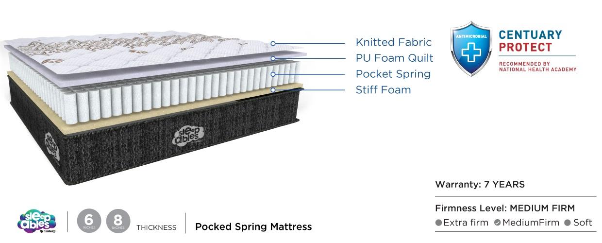 This latest mattress is designed with independent pocket springs, which ensures zero motion transfer even if your partner is tossing and turning. The Sleepables pocket spring mattress uses advanced spring technology with active edge support and a plush PU foam comfort layer and quilt.
