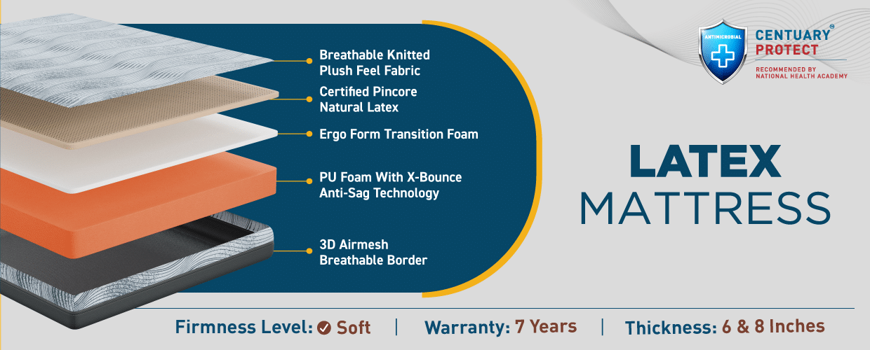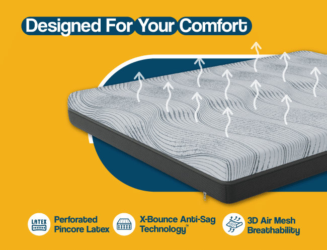 Experience the ultimate sleep experience with Centuary Mattresses Sleepables Pincore Natural Latex mattress. Crafted from 100% natural and breathable latex foam, this mattress features enhanced airflow and durability, with ergo-soft foam technology and a Xbounce Hi-Rez Foam with Anti Sag technology, it offers exceptional support and bounciness. The 3D Air Mesh breathable border keeps your mattress fresh and cool.